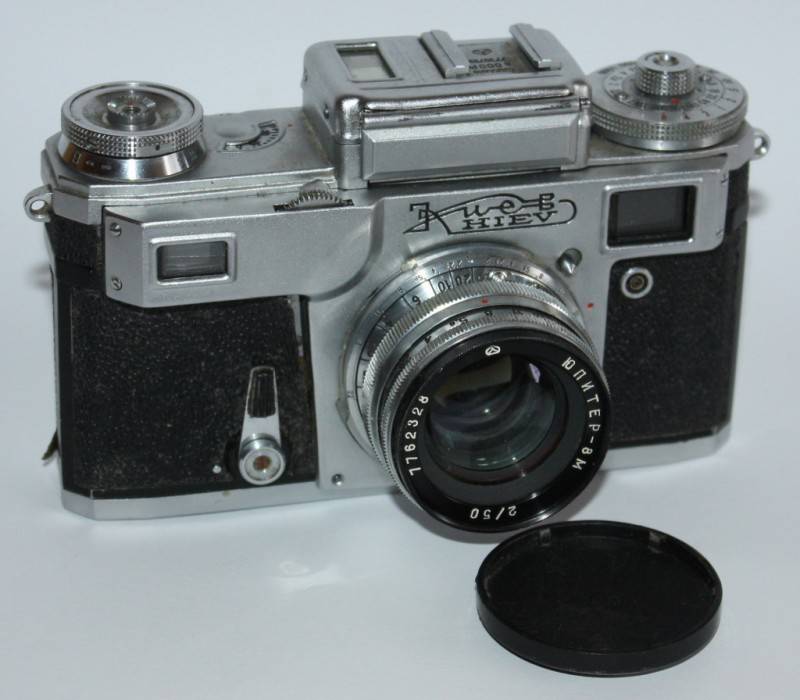 Kiev IV. Serijinis Nr. 7730722. Išlaikymai ½-1/1000 ir ,,B”. Objektyvas Jupiter 8M, Nr. 7762328, židinio nuotolis 53 mm., diafragma 2-22. Užraktas veikia, tačiau kartais stringa, Eksponometras neveikia. Išvaizda gera. Futliaras.