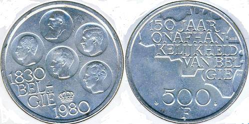 Belgija 500 frankų 1980 m., KM#162, XF+