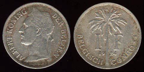 Belgų Kongas 1 frankas 1926 m., KM#21, VF-