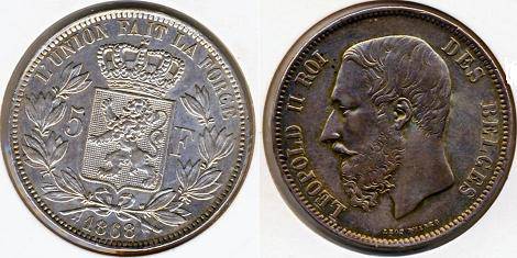 Belgija 5 frankai 1868 m., KM#24, Ag, VF+