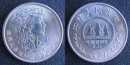 Kinijos LR 1 juanis 1991 m. mergina, KM Y#279, Unc