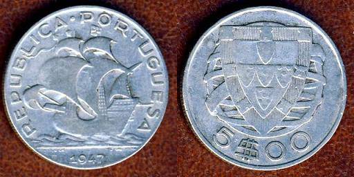 Portugalija 5 eskudai 1947 m., KM#581, Ag, VF