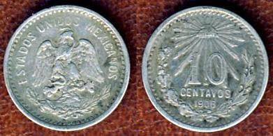 Meksika 10 sentavų 1906 m., KM#428, Ag, VF-