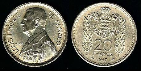 Monakas 20 frankų 1947 m., KM#124, VF