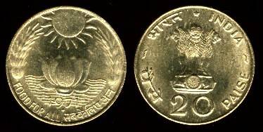 Indija 20 paisų 1971 m. FAO, KM#43.2, Unc