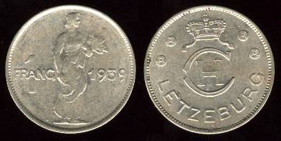 Liuksemburgas 1 frankas 1939 m., KM#44, VF
