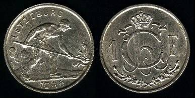Liuksemburgas 1 frankas 1947 m., KM#46.1, VF