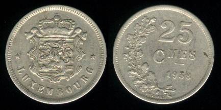 Liuksemburgas 25 santimai 1938 m., KM#42a.1, VF