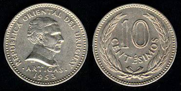 Urugvajus 10 sentesimų 1953 m., KM#35, VF