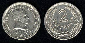 Urugvajus 2 sentesimai 1953 m., KM#33, VF