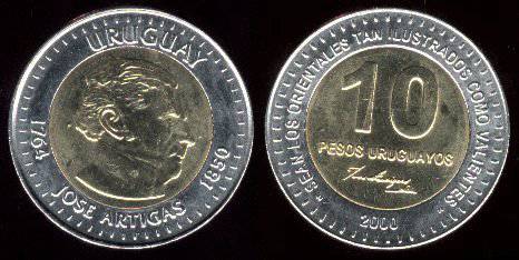 Urugvajus 10 pesų 2000 m., KM#121, XF+