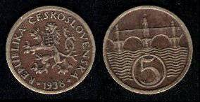 Čekoslovakija 5 heleriai 1938 m., KM#6, VF+