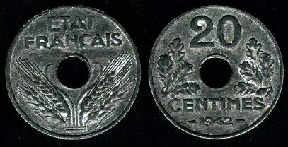 Prancūzija 20 santimų 1943 m., KM#900.2, VF