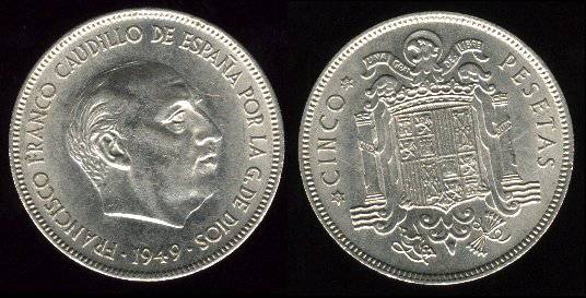 Ispanija 5 pesetos 1949//50 m., KM#778, XF-