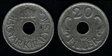 Vengrija 20 filerių 1941 m., KM#520, VF+