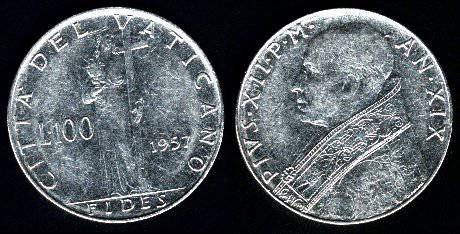 Vatikanas 100 lirų 1955 m., KM#55, XF