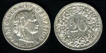 Šveicarija 20 rapenų 1921 m., KM#29, XF
