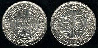 Vokietija 50 reichspfenigų 1928 m. J, KM#49, VF
