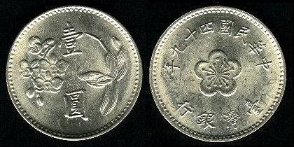 Kinija-Taivanis 1 juanis 1960 m., KM#536, Unc-