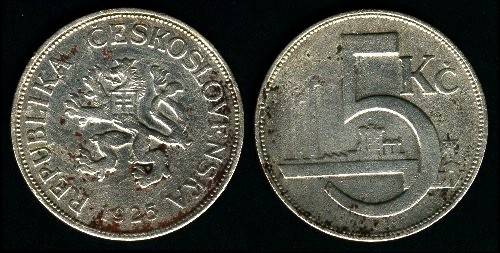 Čekoslovakija 5 kronos 1926 m., KM#10, VF