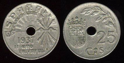Ispanija 25 sentimai 1937 m., KM#753, VF