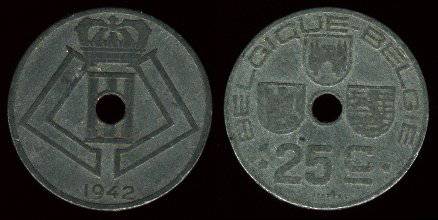 Belgija 25 santimai 1942 m., KM#131, VF-