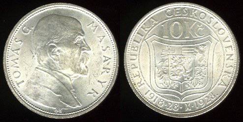Čekoslovakija 10 kronų 1928 m.Independ,KM#12,Ag,XF
