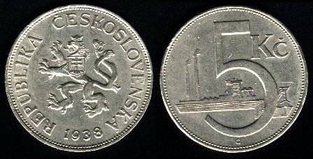 Čekoslovakija 5 kronos 1938 m., KM#11a, VF+
