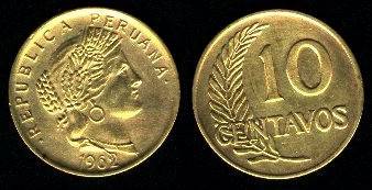 Peru 10 sentavų 1960 m., KM#224.2, VF
