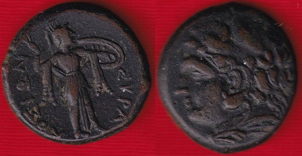 Raidė A greičiausiai žymi Atėnus („ΑΘΕ“ – Atėnų trumpinys dažnai būdavo ant monetų). Ši moneta nėra sidabrinė tetradrachma (su pelėda), o vėlesnė bronzinė, su Atėnės pilna figūra – tai retesnis, bet gerai žinomas tipas.