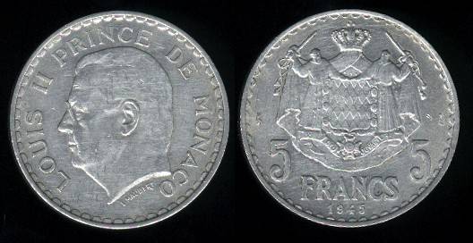 Monakas 5 frankai 1945 m., KM#122, VF