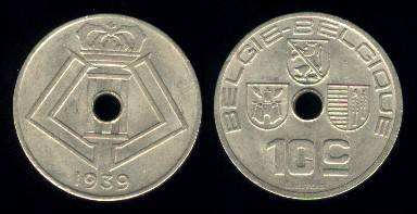 Belgija 10 santimų 1939 m., KM#113.1, VF
