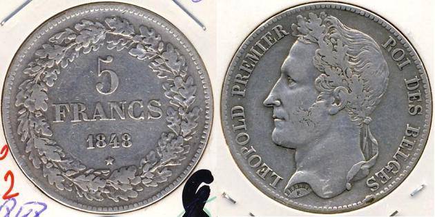 Belgija 5 frankai 1848 m., KM#3.2, Ag, VF-