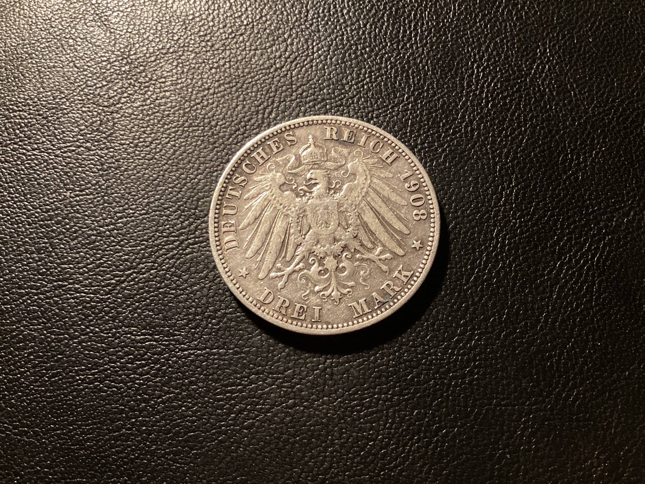 Vokietija-Viurtenburgas 3 markes 1908F Ag