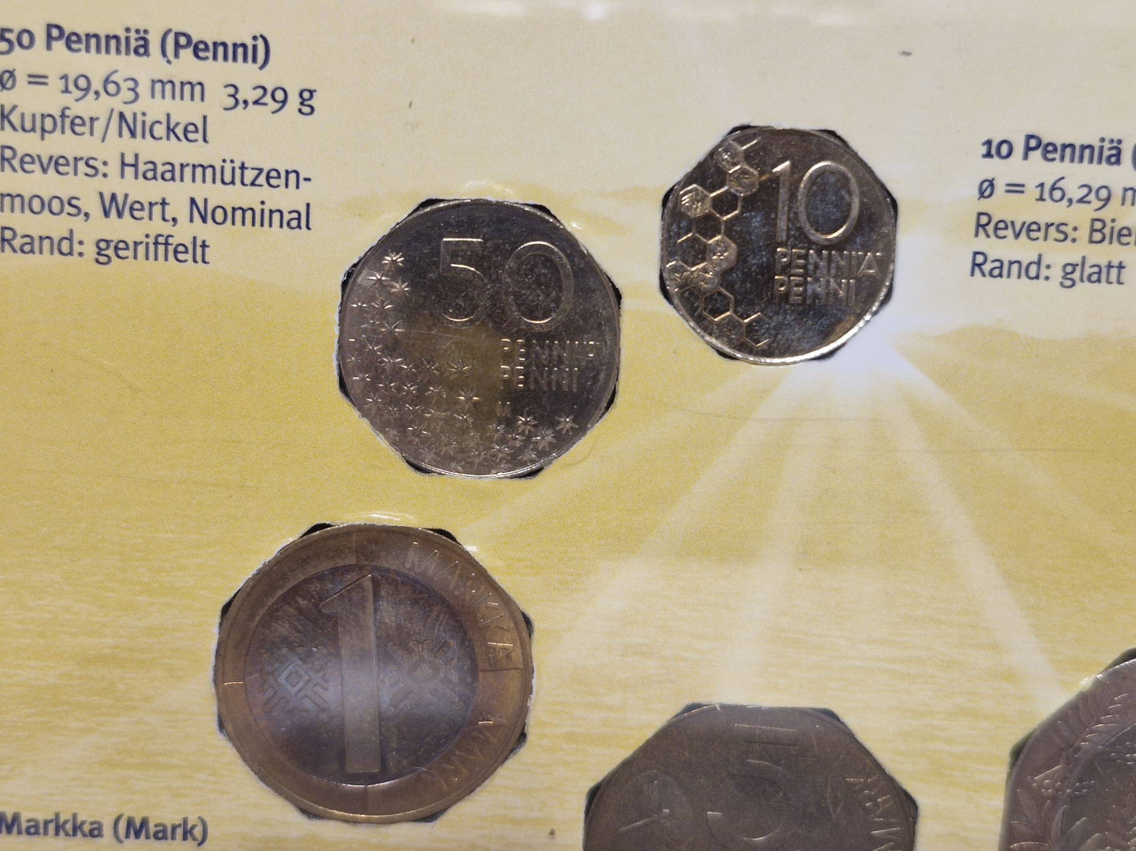 Rinkinyje pateikiamos paskutinės Suomijos nacionalinės valiutos – markės ir peniai – monetos prieš euro įvedimą.
