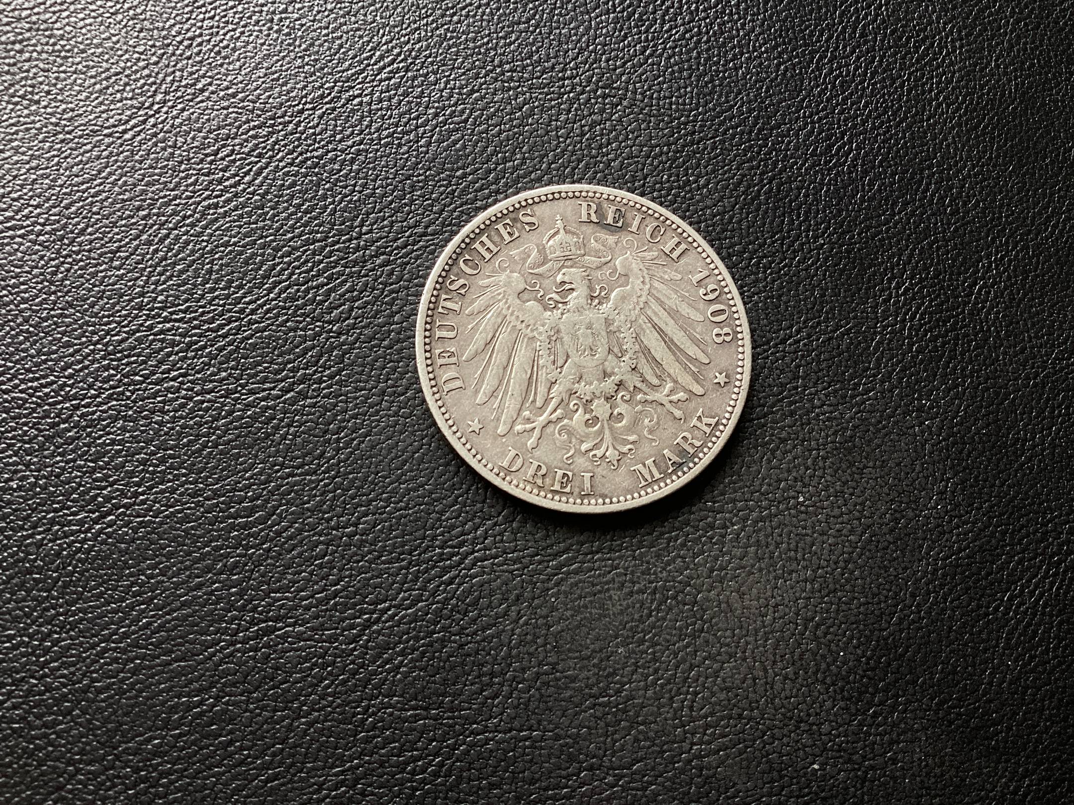 Vokietija-Wuertenburgas. 3 markes 1908. Ag