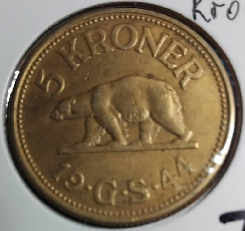 Grenlandija 5 kronos 1944 m., KM#9, VF