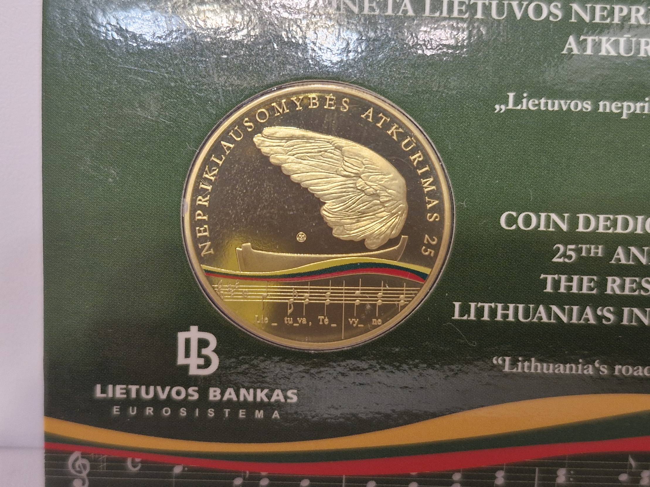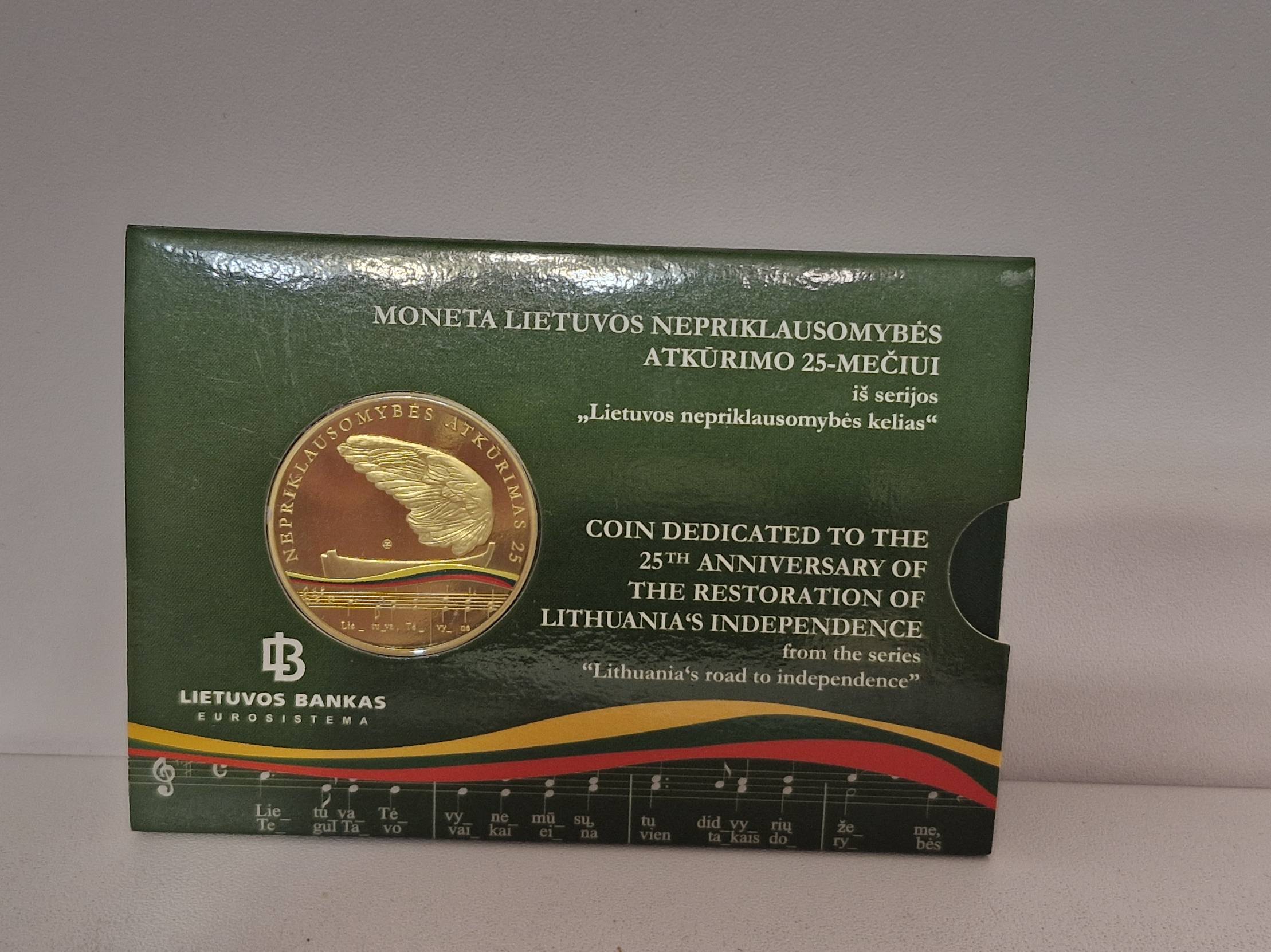Originali Lietuvos banko išleistą 5 eurų kolekcinė moneta, skirta Lietuvos nepriklausomybės atkūrimo 25-erių metų sukakčiai paminėti.