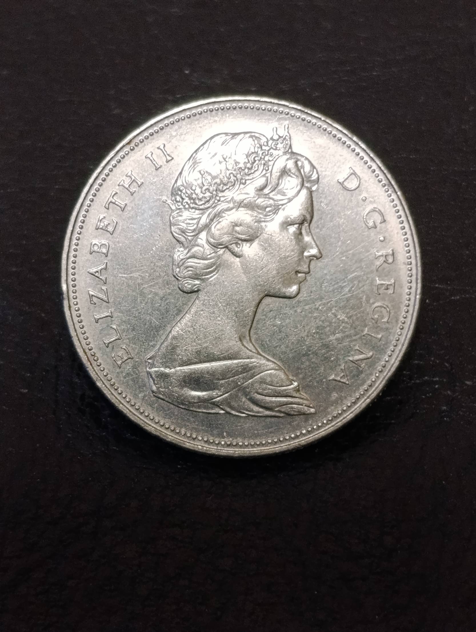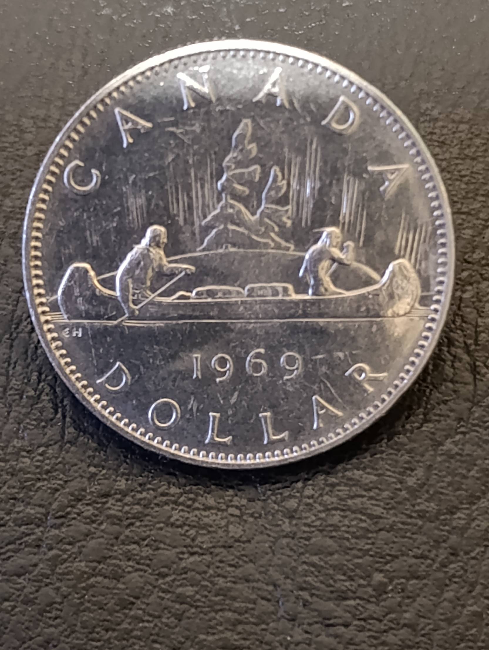1969 metai (matosi reverse pusėje)Averse: Karalienė Elžbieta II (Elizabeth II)Reverse: kanoja su indėnais (tradicinis „Voyageur“ dizainas)