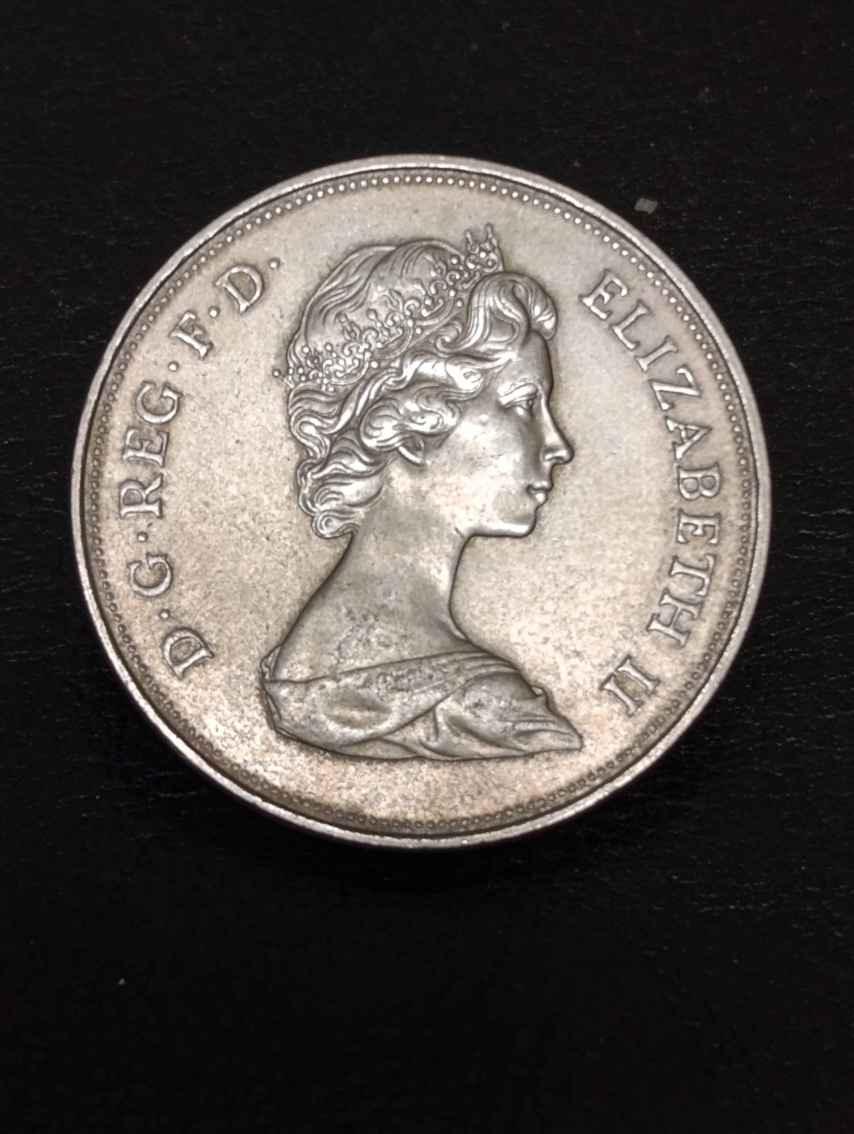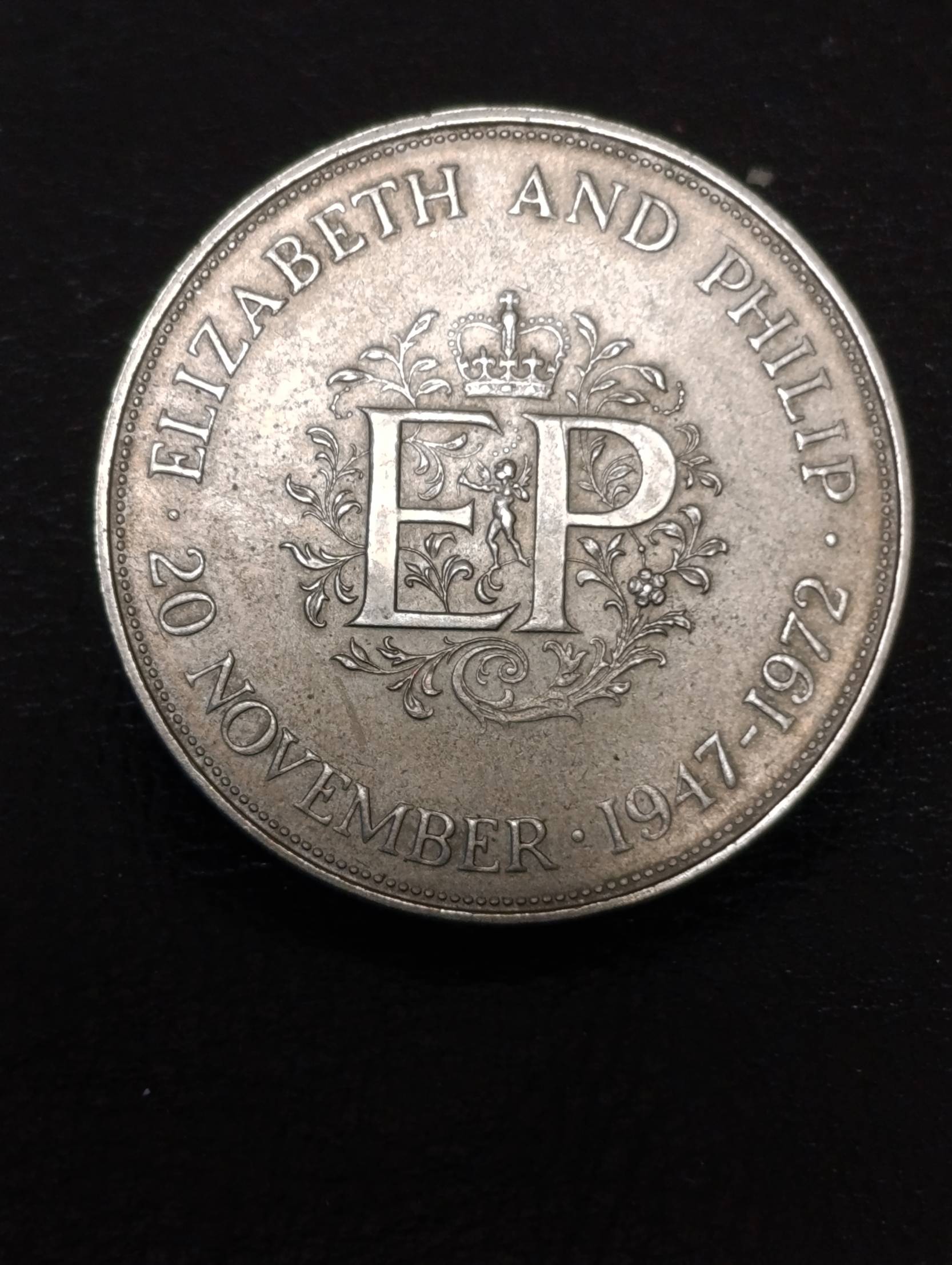 Tai Didžiosios Britanijos 25 pensų (Crown) proginė moneta, skirta karalienės Elžbietos II ir princo Filipo sidabrinėms vestuvėms.