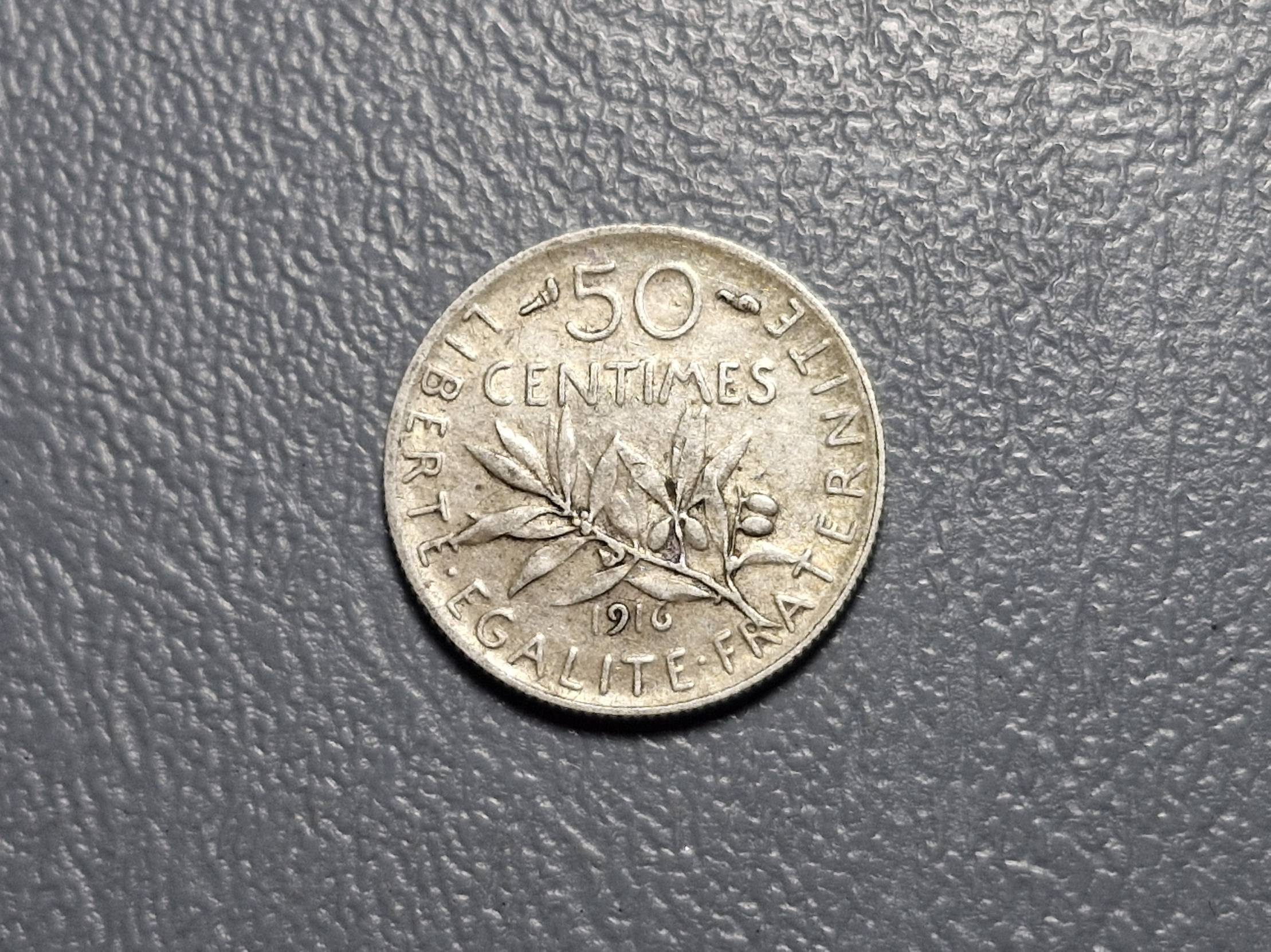 Prancūzija 50 santimų, 1916 KM# 854 AG 0.835