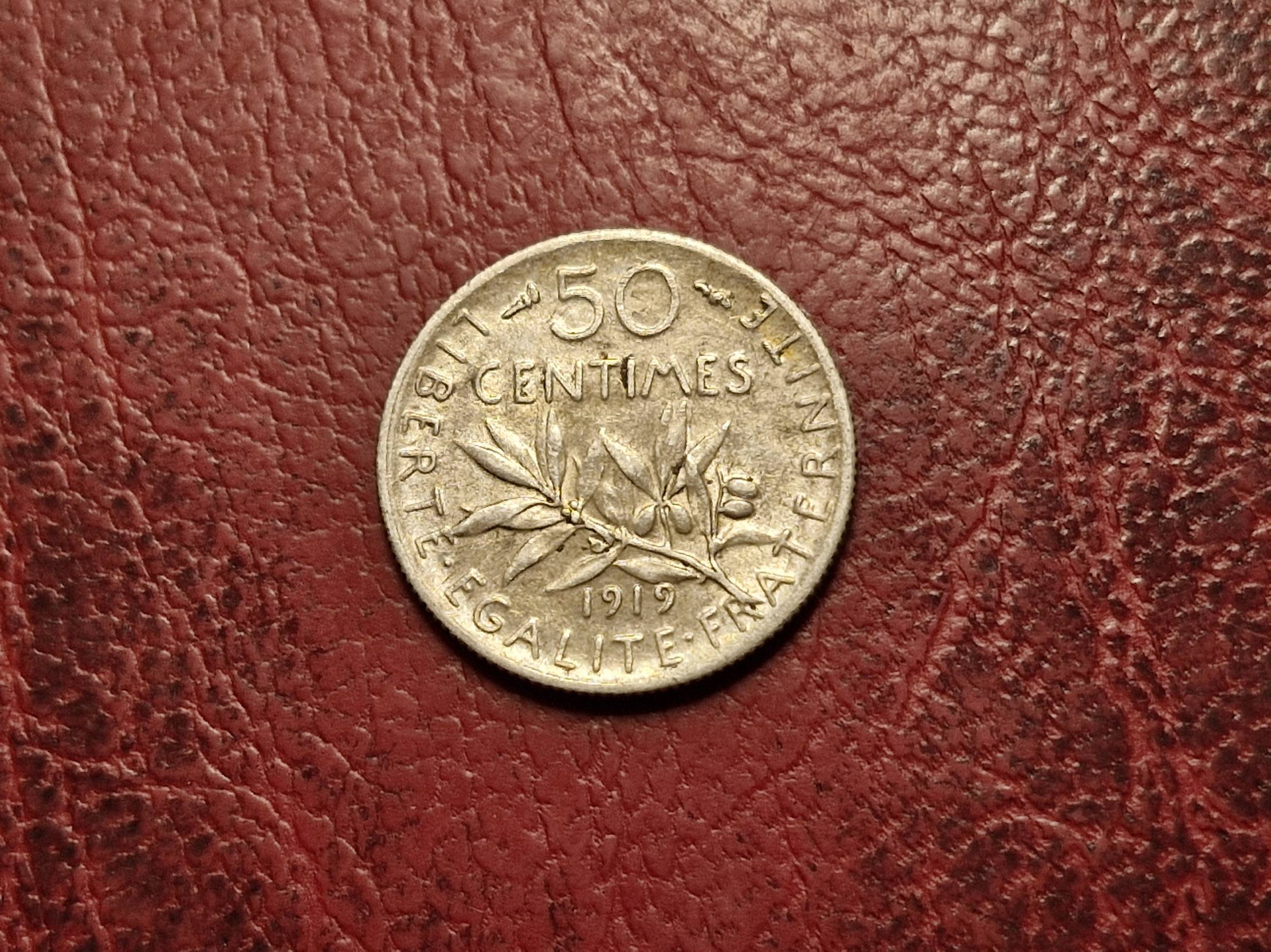 Prancūzija 50 santimų, 1919 KM# 854 AG 0.835