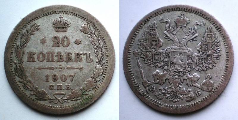 Rusija 20 Kopeik 1907 Sidabras Retoka Nuo.1Lt