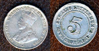 Malaizija-Straits Settl. 5 centai 1919,KM#31,Ag,F+