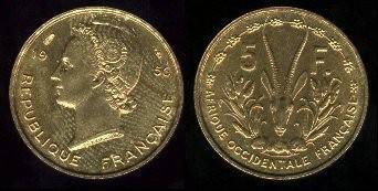 Prancūzų Vakarų Afrika 5 frankai 1956 m.,KM#5,VF