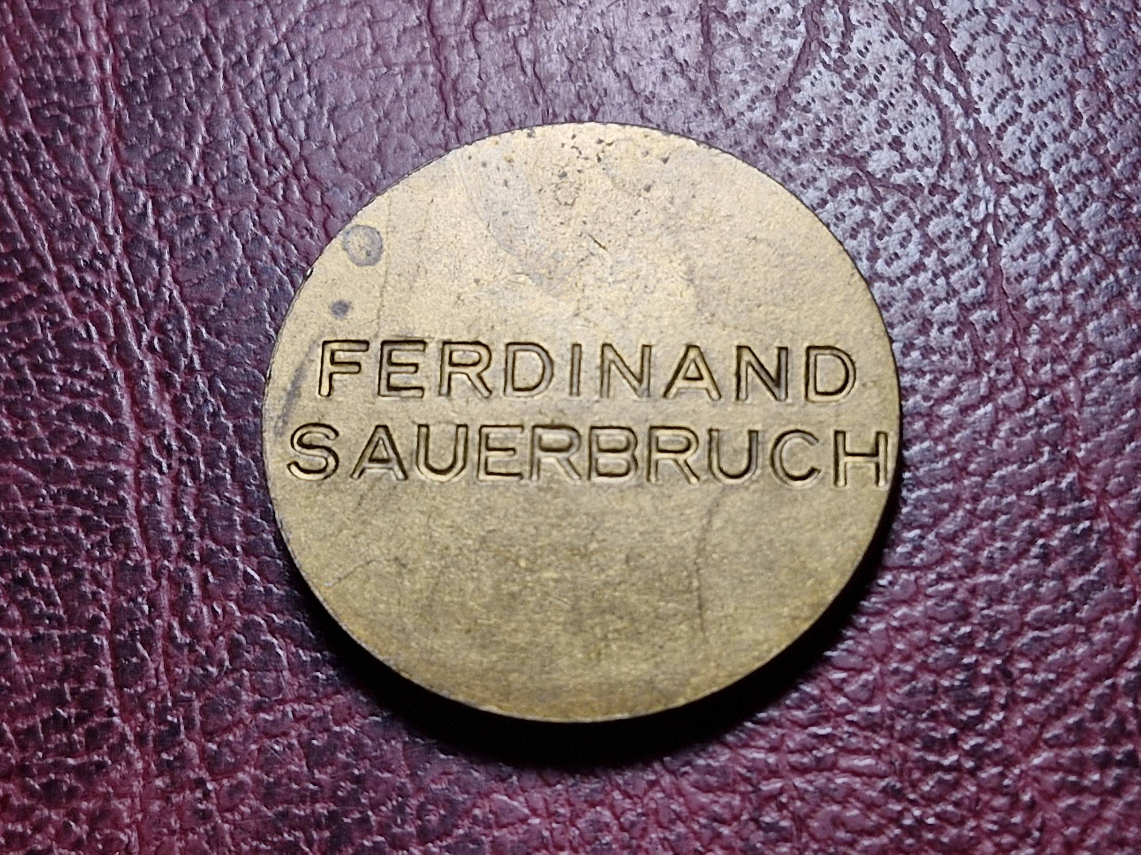 Medalyje pavaizduotas asmuo yra Ernstas Ferdinandas Sauerbruchas, garsus krūtinės ląstos chirurgijos pradininkas ir pneumatinės kameros išradėjas. (1875-1951)