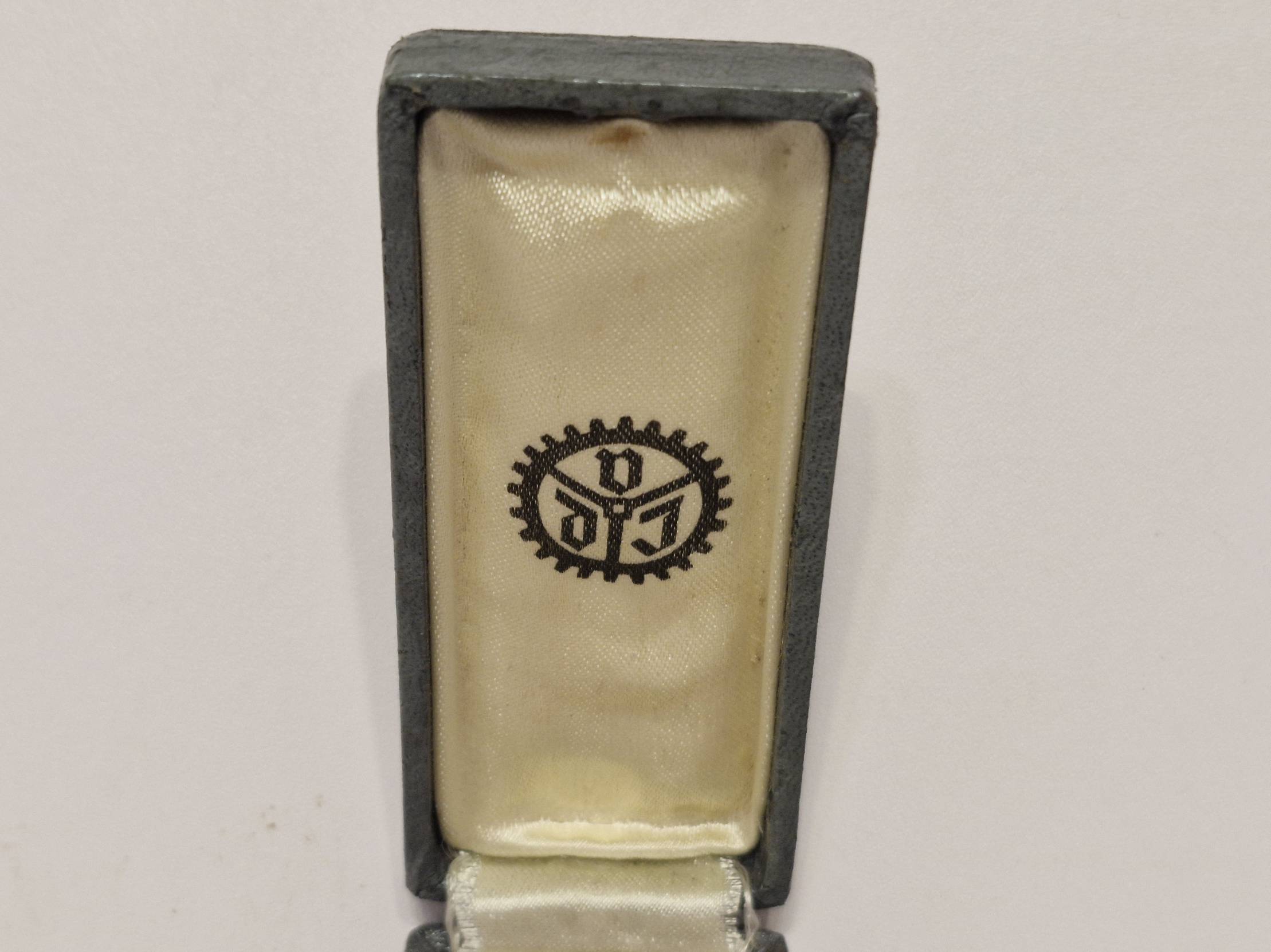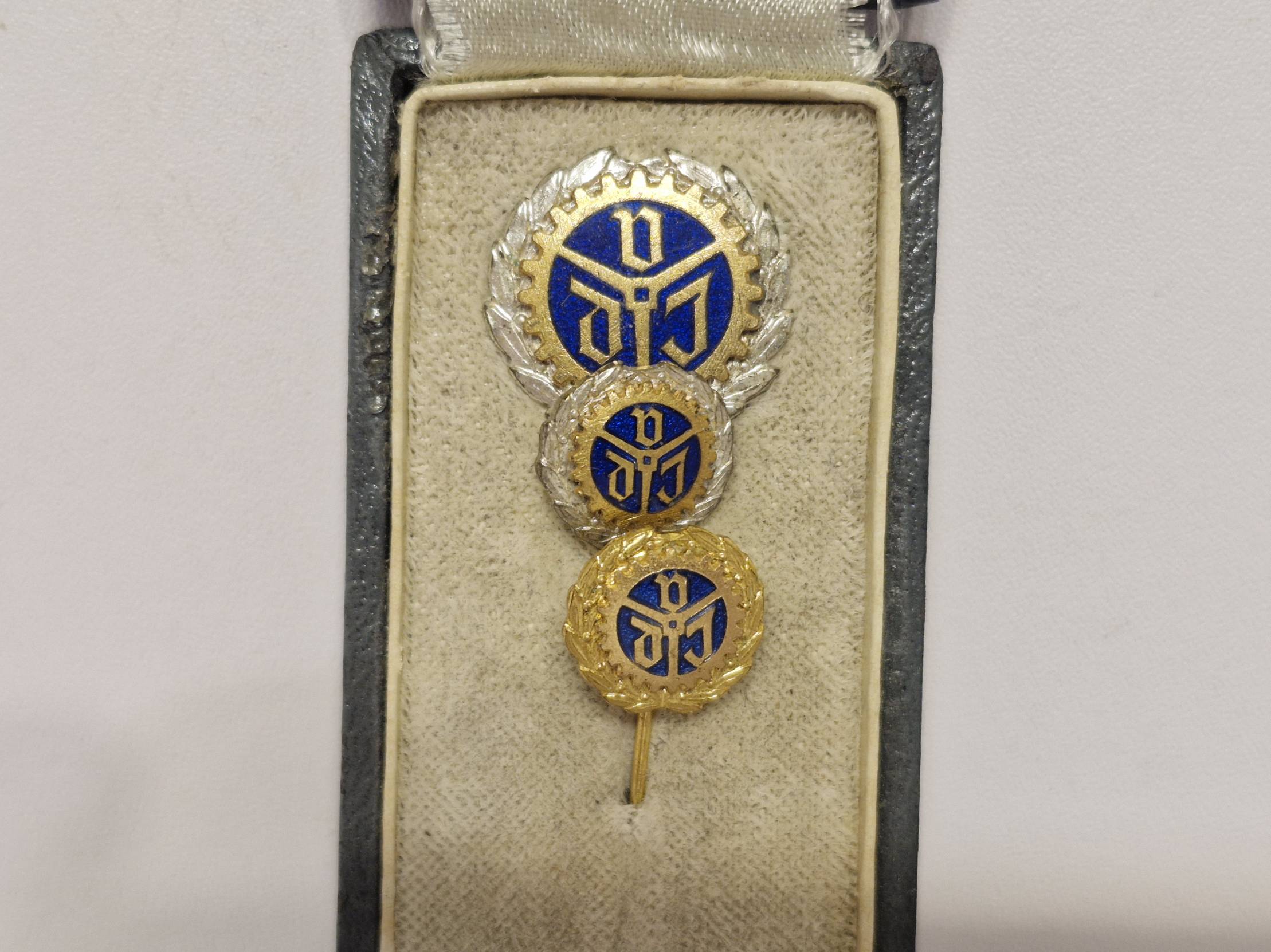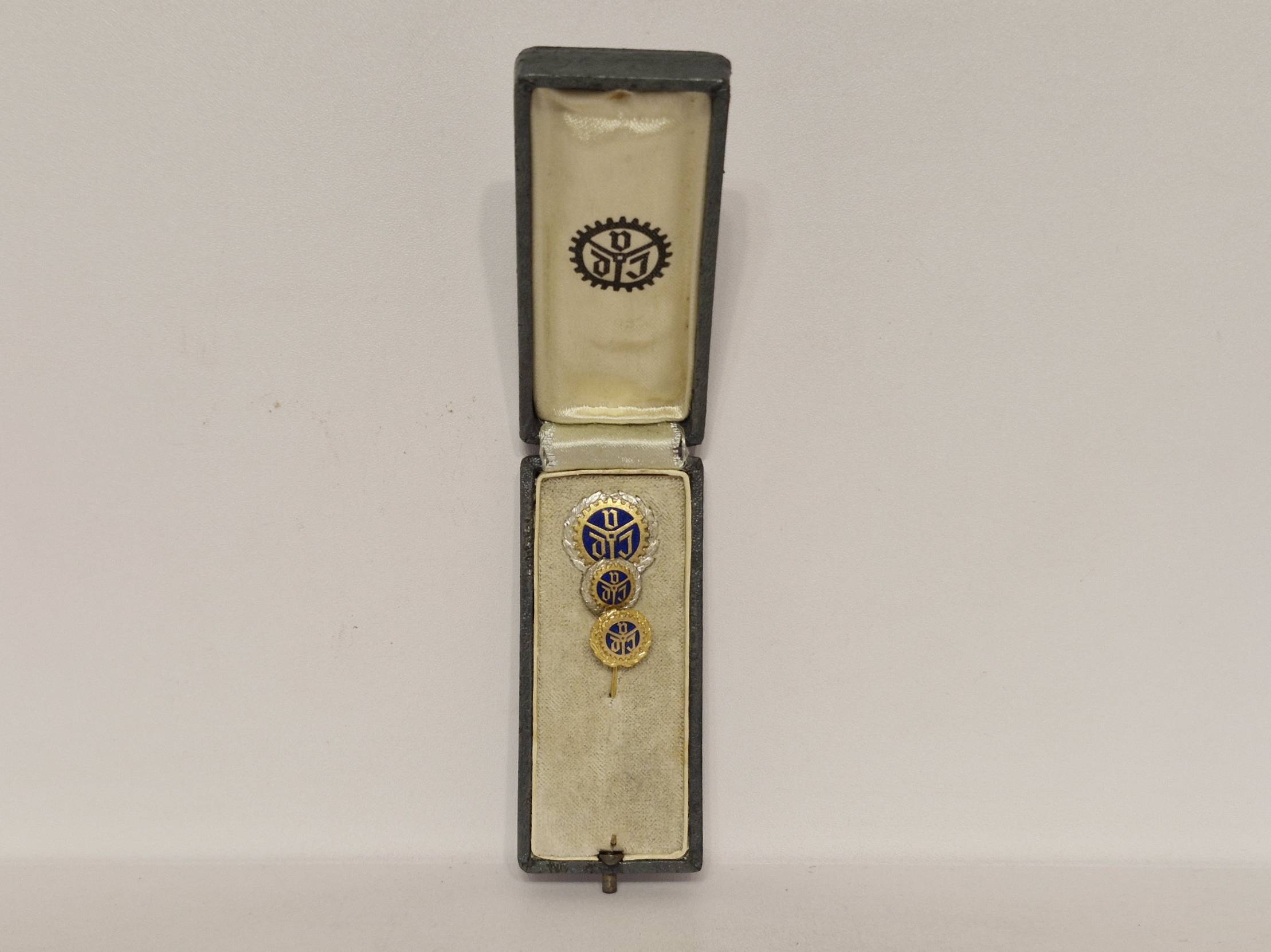 Tai yra Vokietijos inžinierių asociacijos (VDI) ženkleliai („Verein Deutscher Ingenieure“), skirti ilgametės narystės jubiliejams paminėti. Su originalia dežute, kuri turi matomus laiko nusidėvėjimo požymius. Prekės būklė matoma foto. Prekės ar prekių kombinuotas siuntimas Lietuvoje 2 EUR