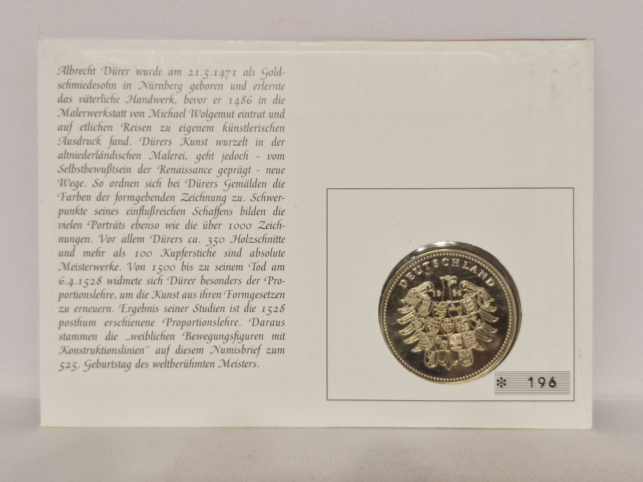 Tai yra numizmatinis vokas (vok. Numisbrief), išleistas Vokietijoje 1996 m. gegužės 21 d. paminėti 525-ąsias garsaus renesanso menininko Albrechto Diurerio (vok. Albrecht Dürer) gimimo metines.