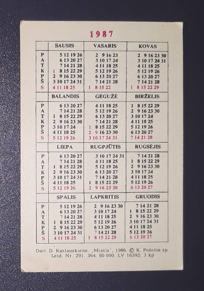 Kalendoriukas Lietuva 1987 WILDLIFE Dru =01=