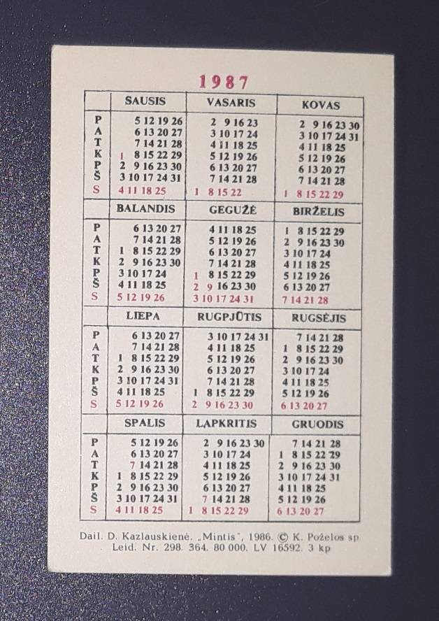 Kalendoriukas Lietuva 1987 WILDLIFE Dru =08=